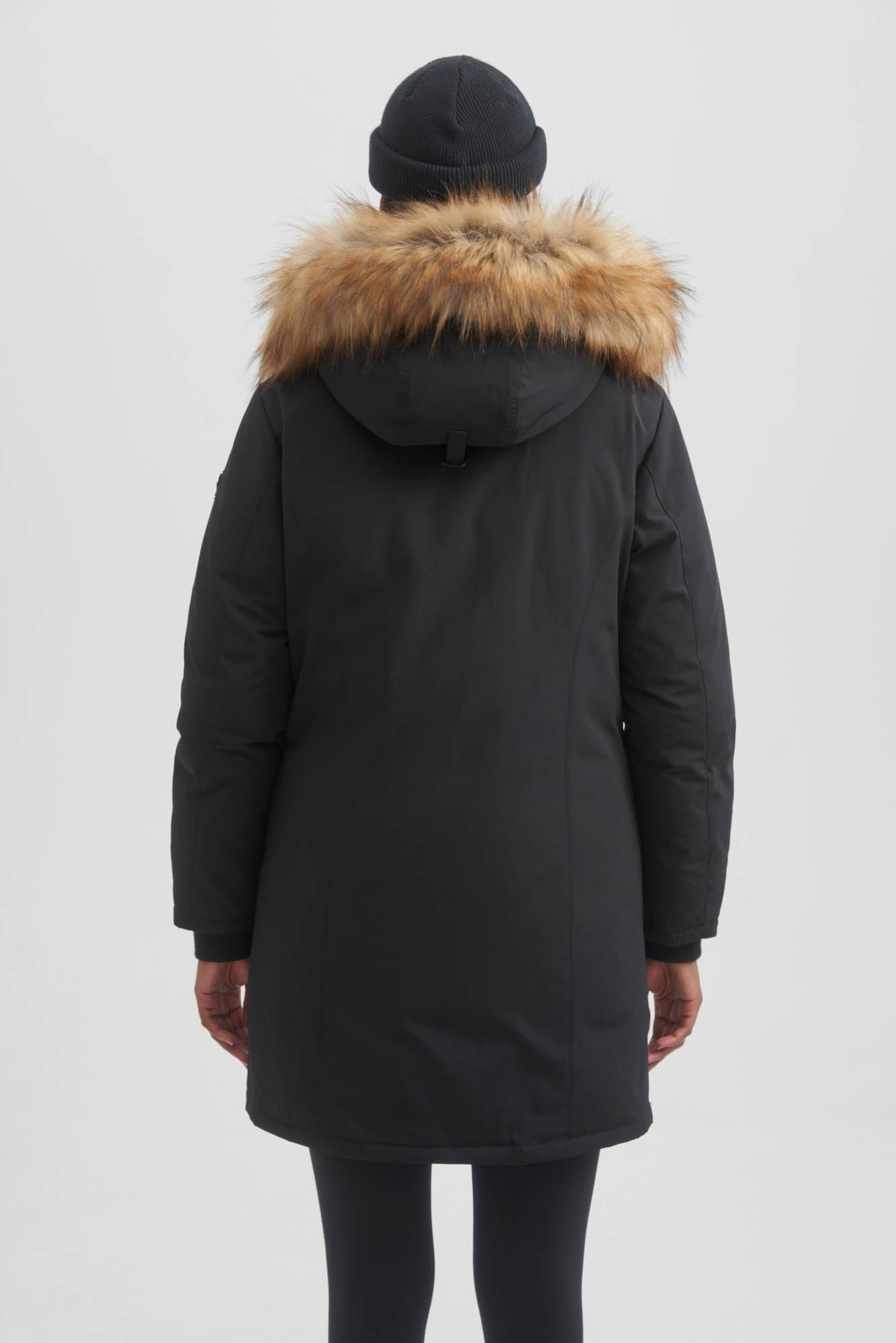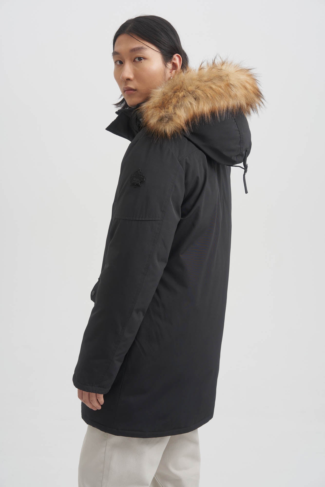 - Capuchon détachable avec garniture détachable de fausse fourrure de raton laveur